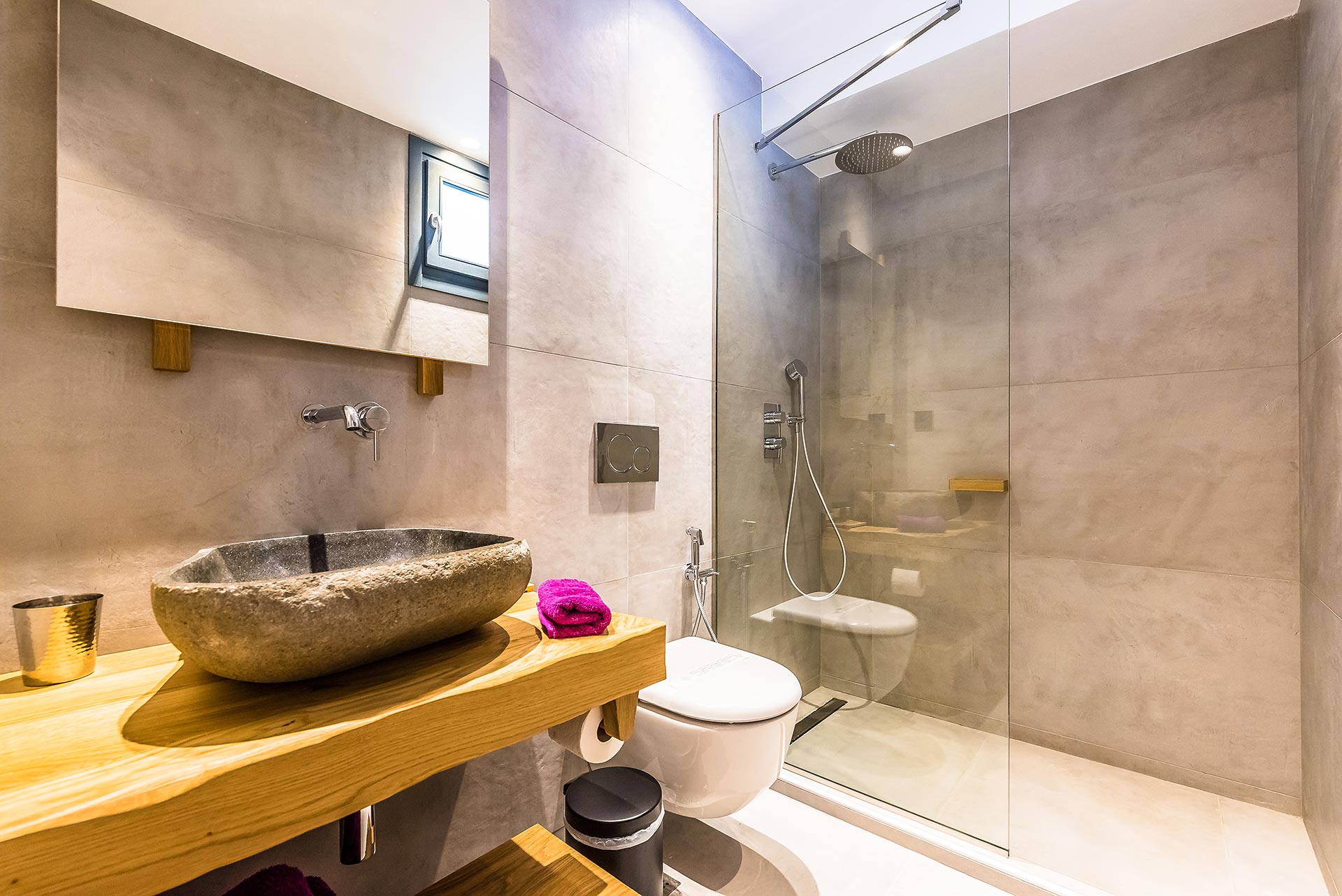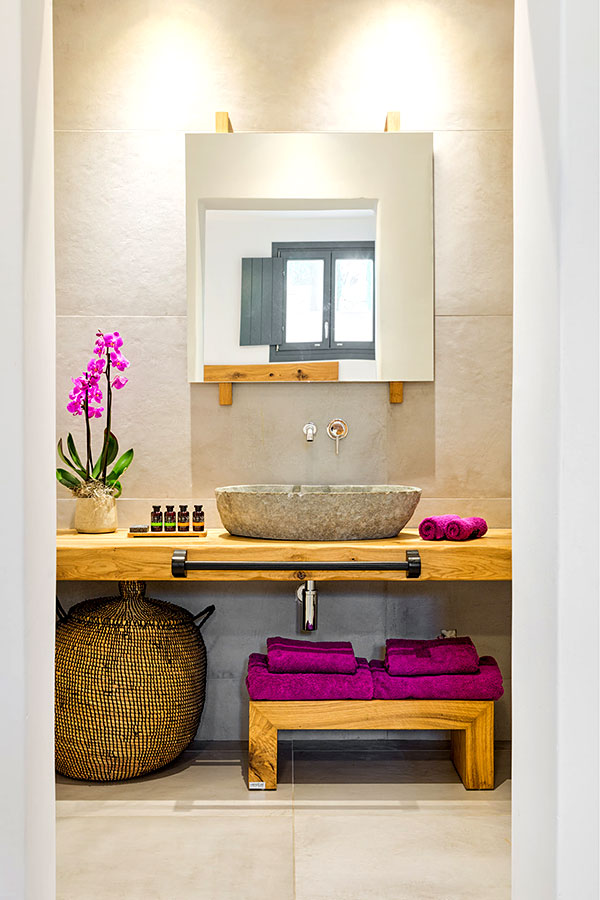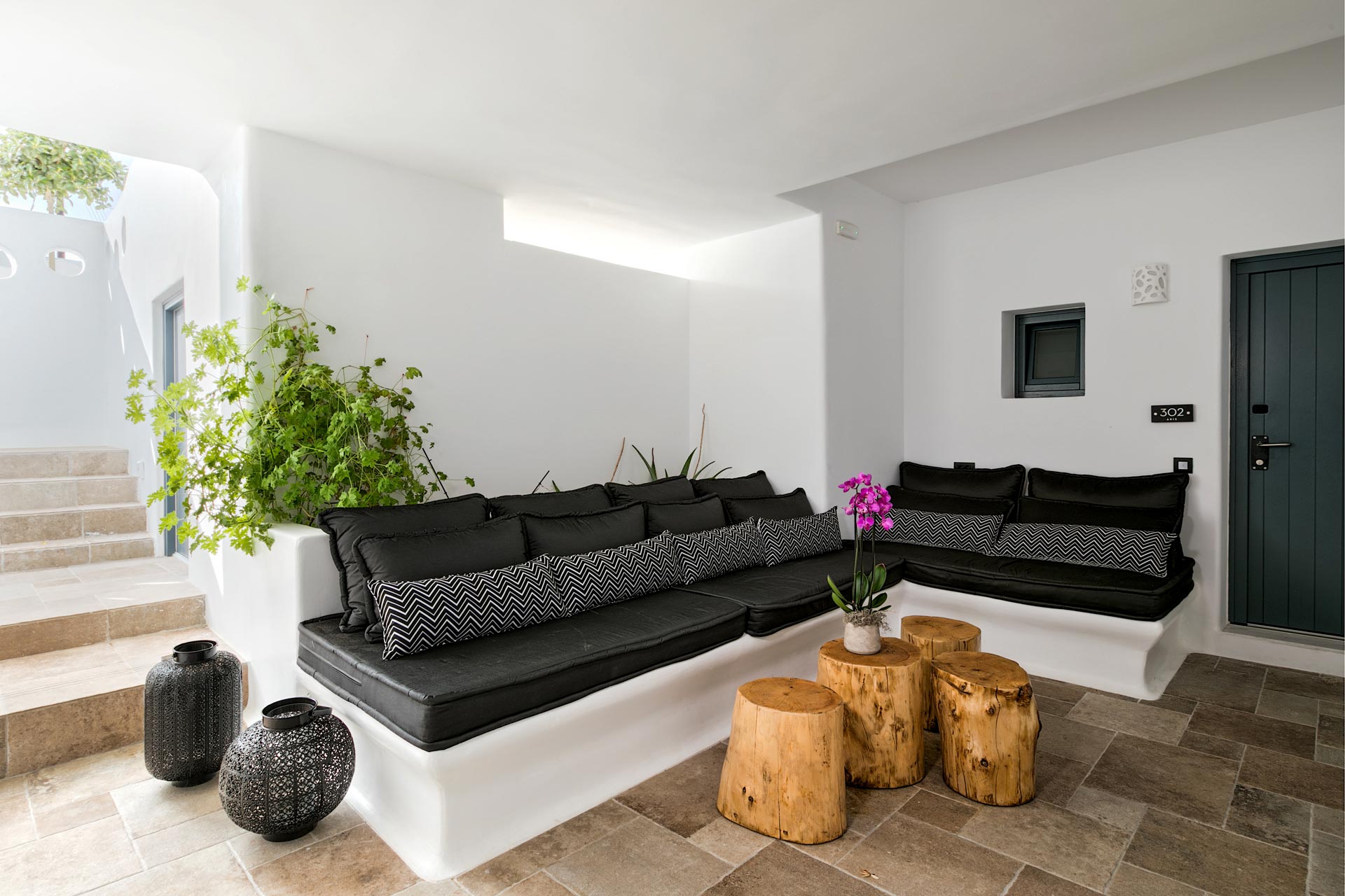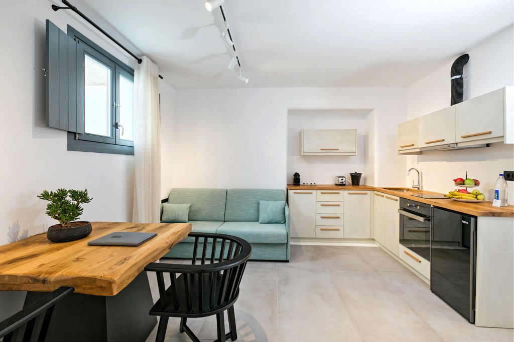 Located at the semi-basement level and enhanced by natural light, these spacious and inviting deluxe rooms seamlessly combine traditional island architecture with refined modern elements. Designed to accommodate up to four guests, they offer an elegant and comfortable retreat in the heart of Mykonos.