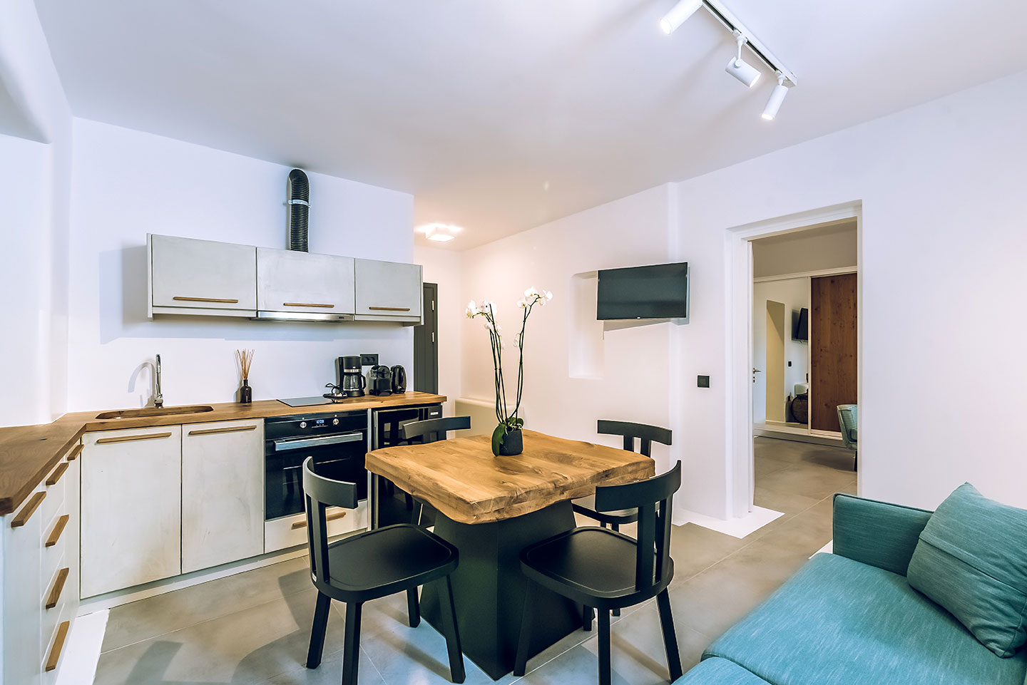 The layout features a master bedroom with a king-size double bed, complemented by a generously sized open-plan living area with a sofa-bed. Thoughtfully designed interiors ensure both functionality and style, providing all the modern comforts expected while maintaining a sense of understated luxury.